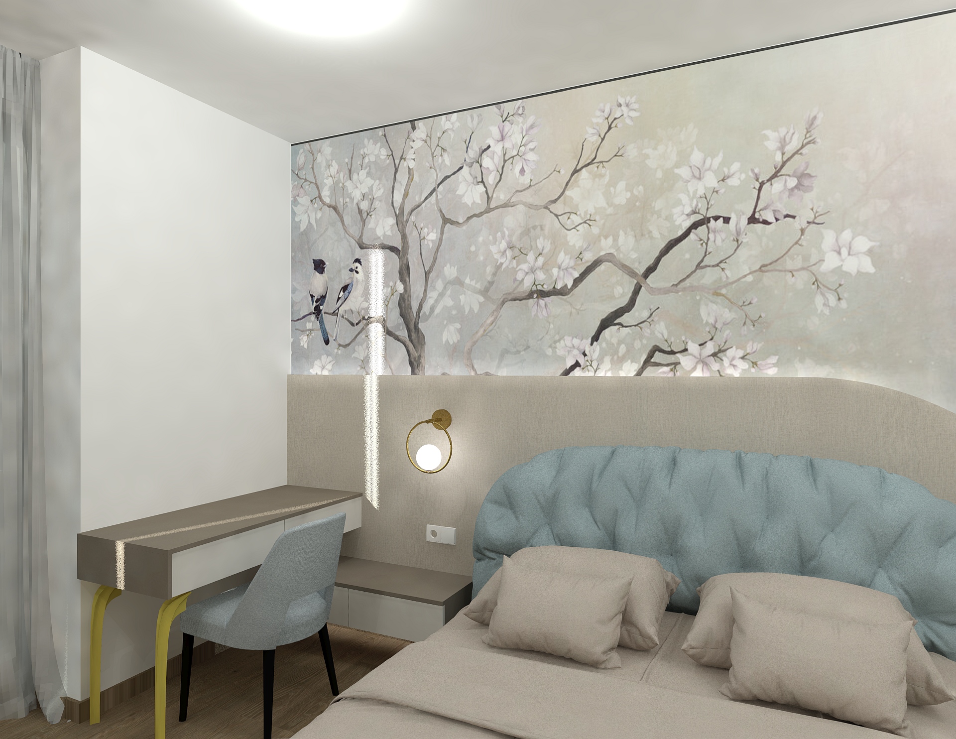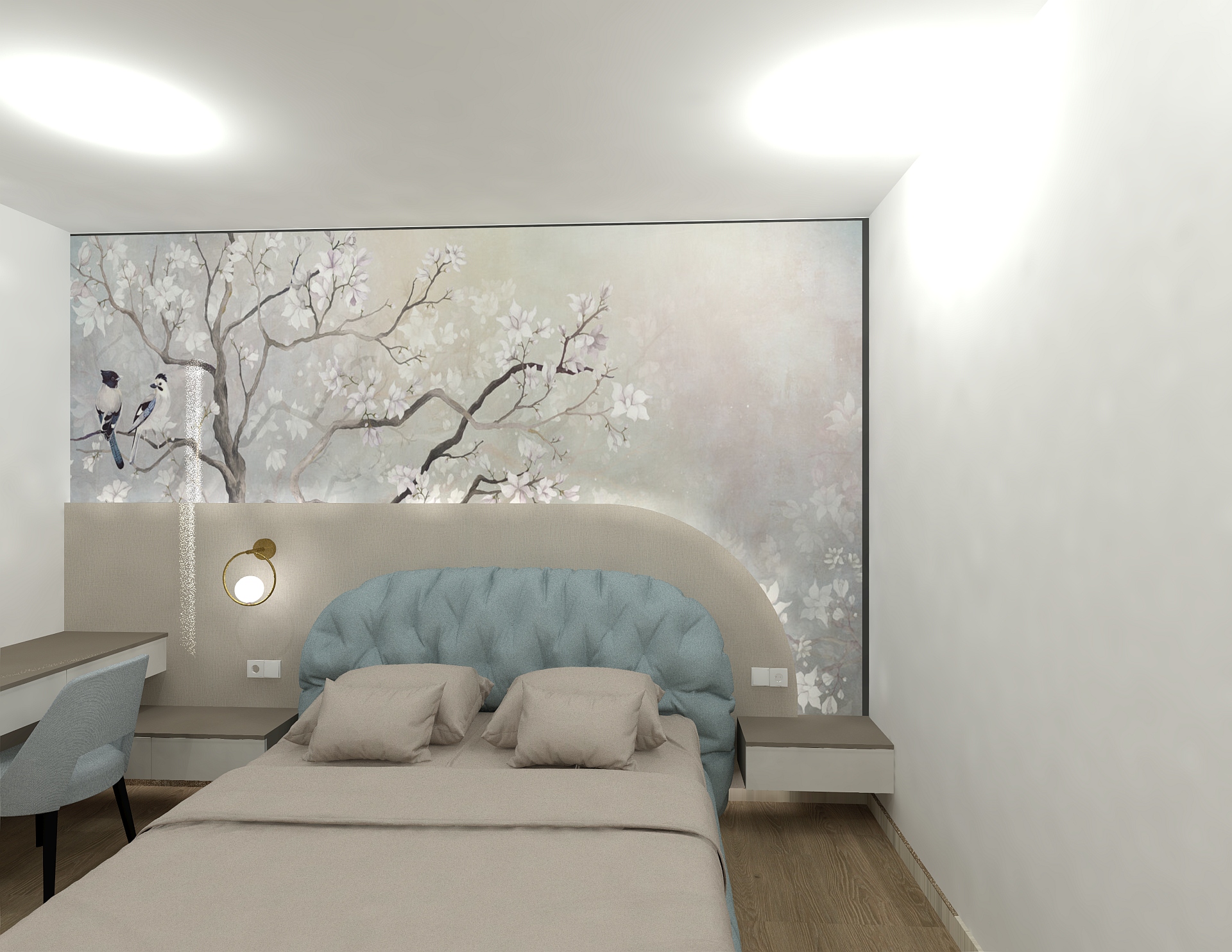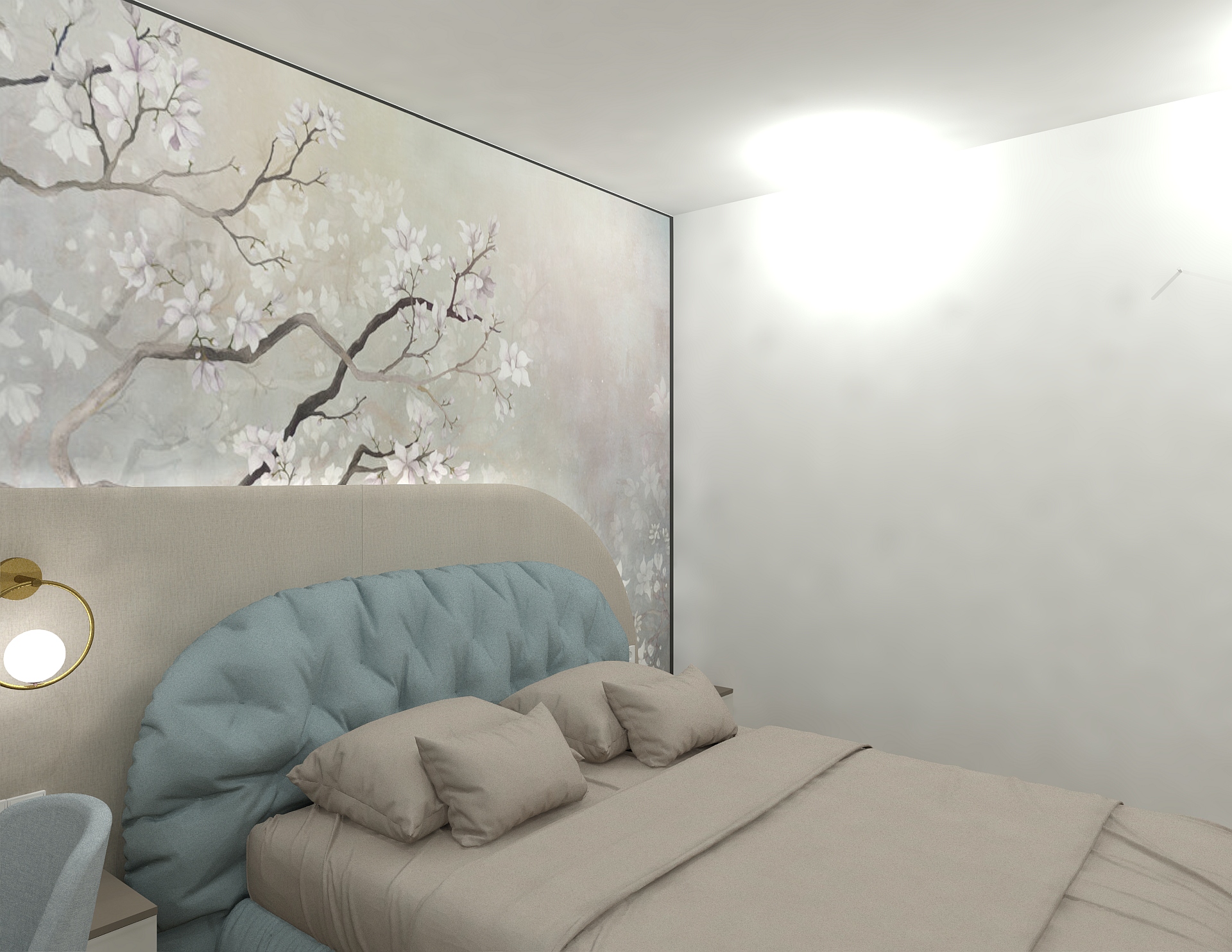 Dormitorul impresionează printr-un tapet artistic și un pat tapițat realizat în fabrica Unican. Modelul de pat Globo pe care il regasisti aici . Soluțiile de depozitare și designul integrat fac ca acest spațiu să fie atât confortabil, cât și funcțional.