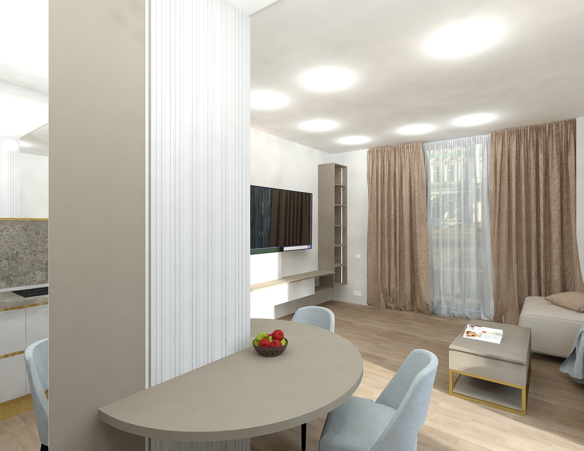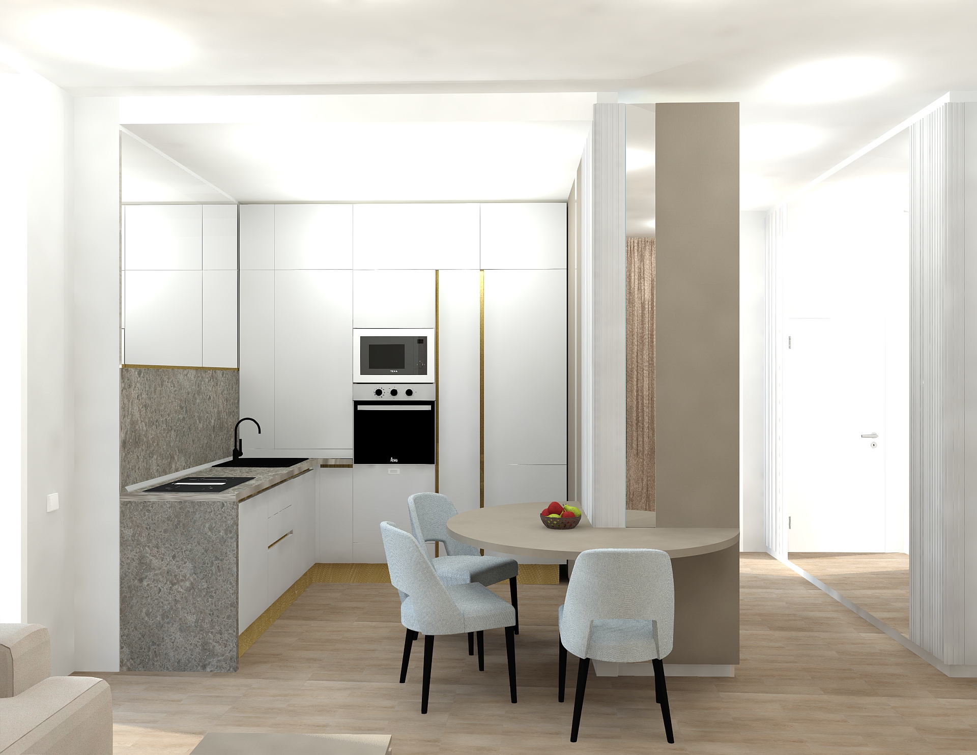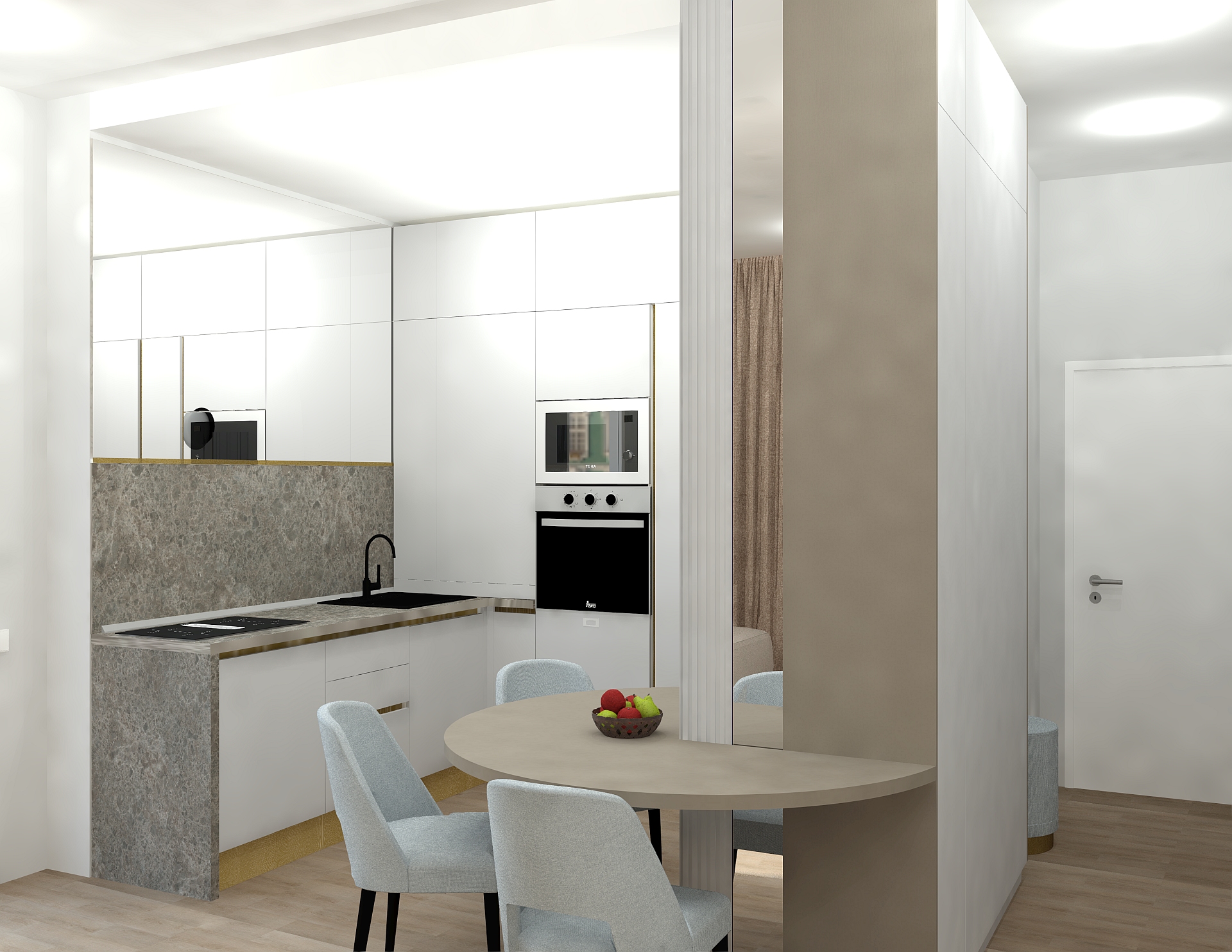 Livingul Topaz reunește zona de zi, dining și bucătărie într-un spațiu modern, luminos și aerisit. Mobilierul pe comandă și finisajele premium sunt completate de o paletă cromatică neutră, cu accente calde.