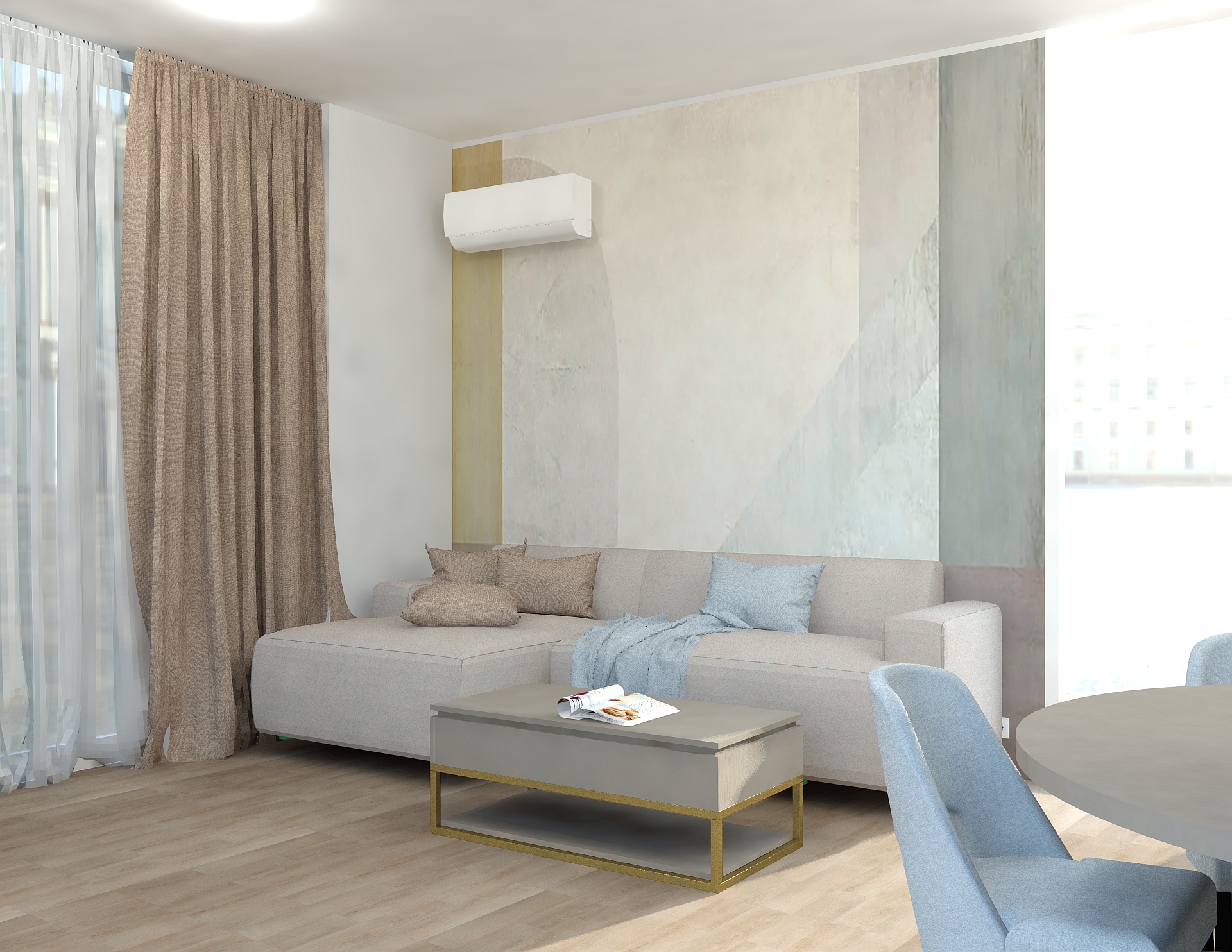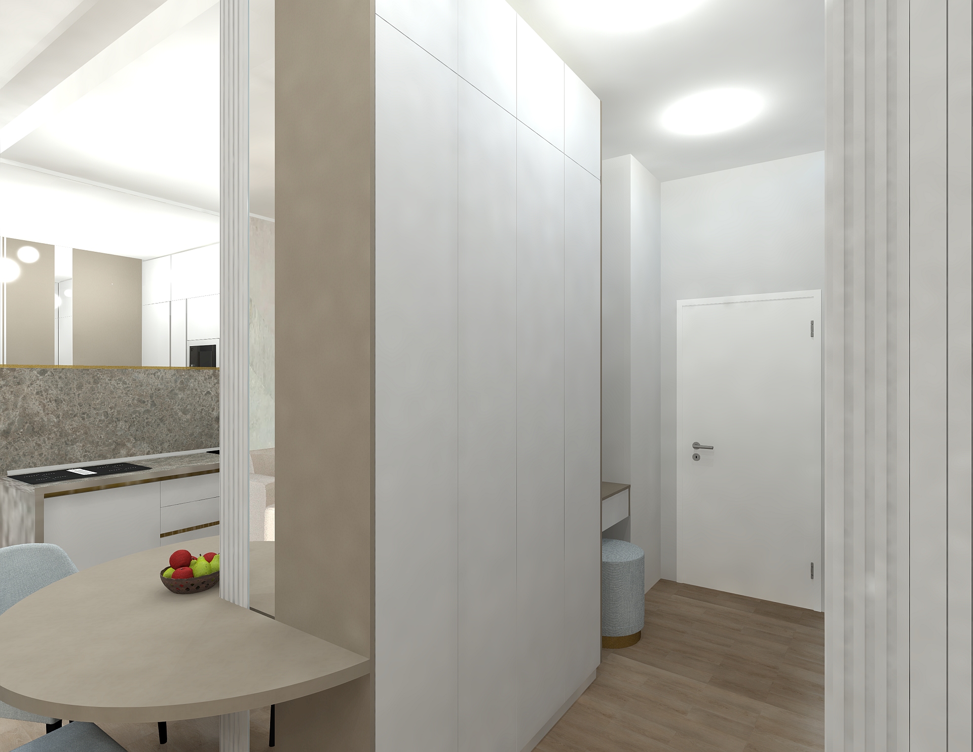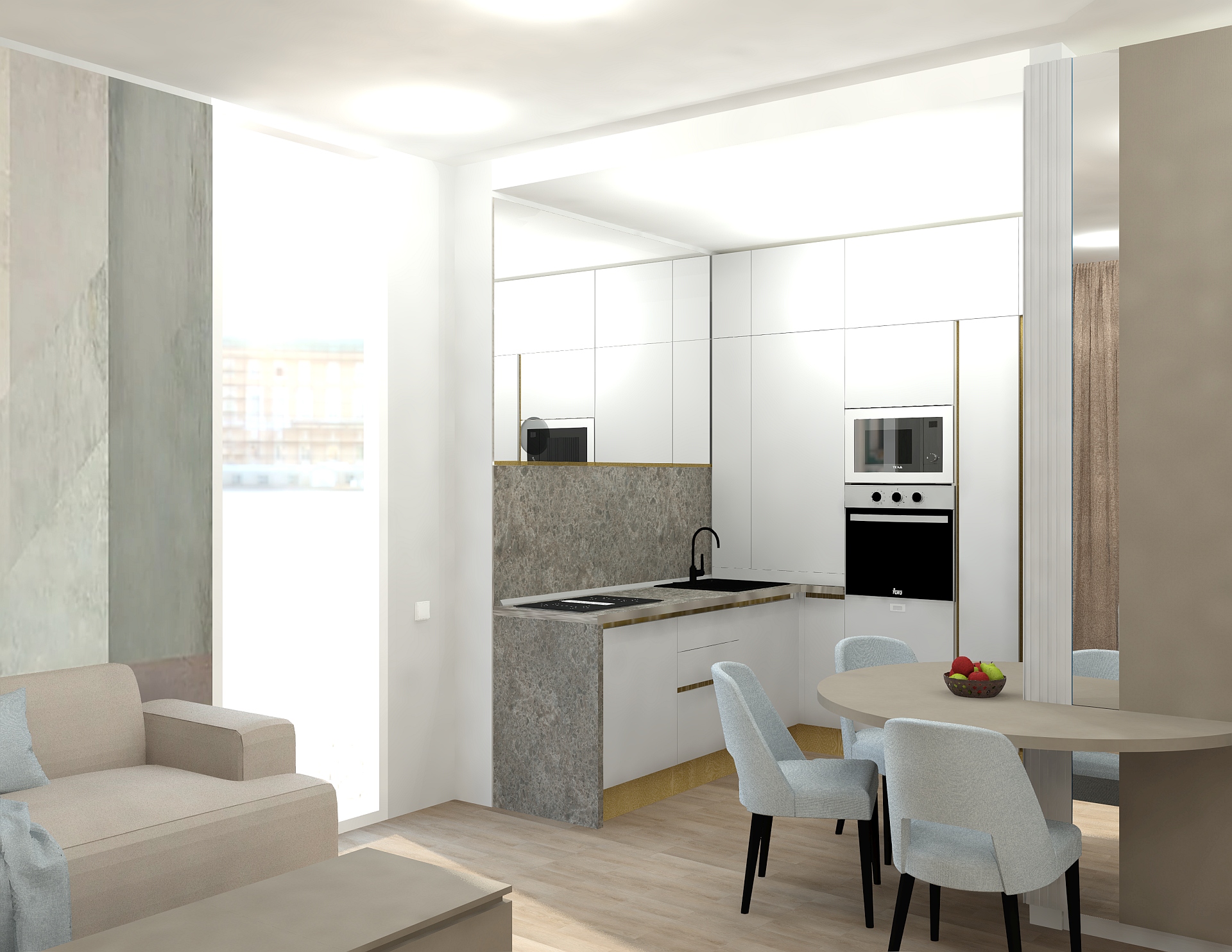 Livingul Topaz reunește zona de zi, dining și bucătărie într-un spațiu modern, luminos și aerisit. Mobilierul pe comandă și finisajele premium sunt completate de o paletă cromatică neutră, cu accente calde.