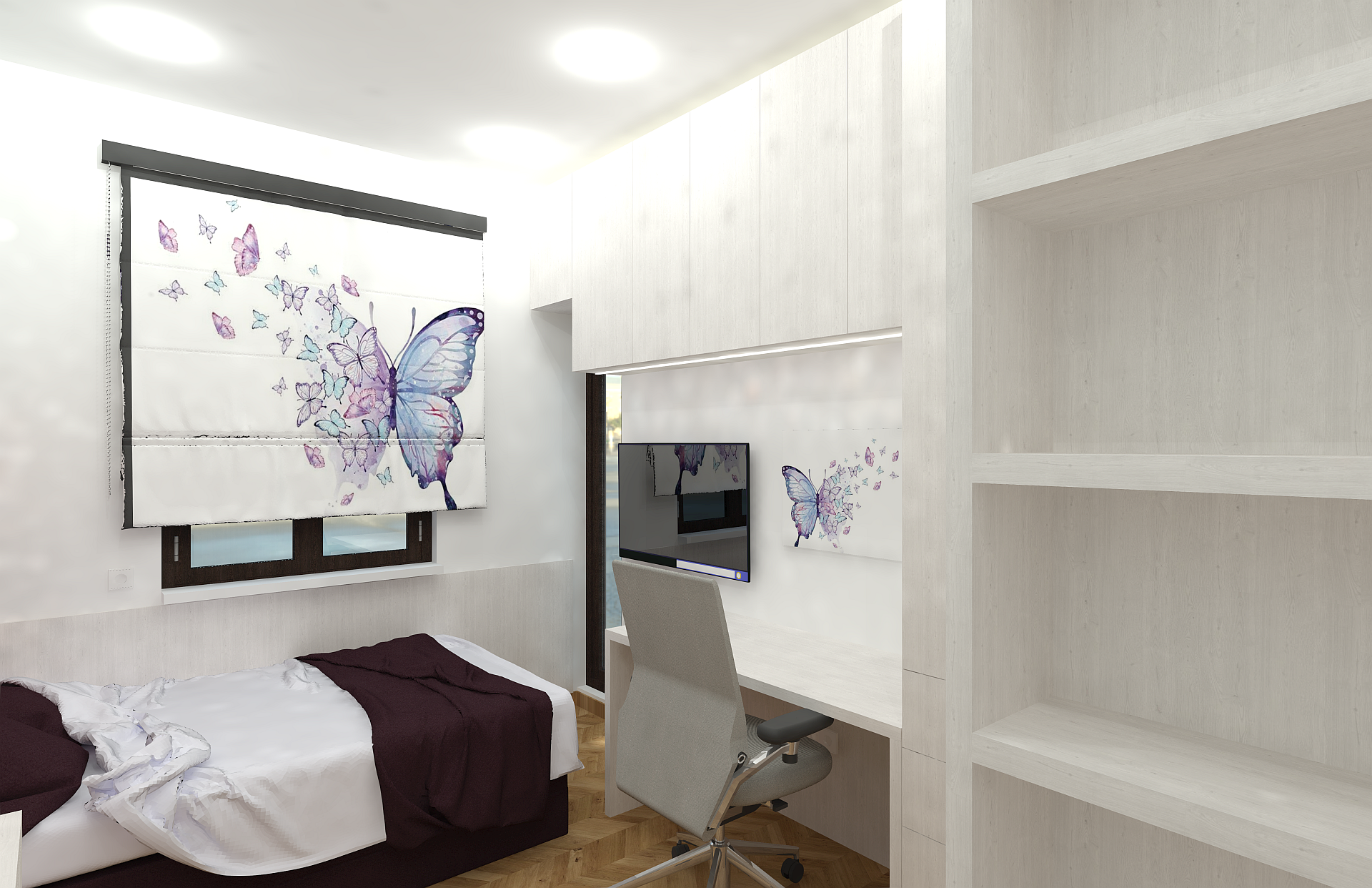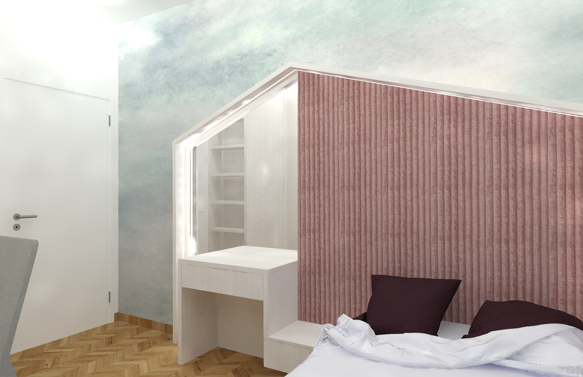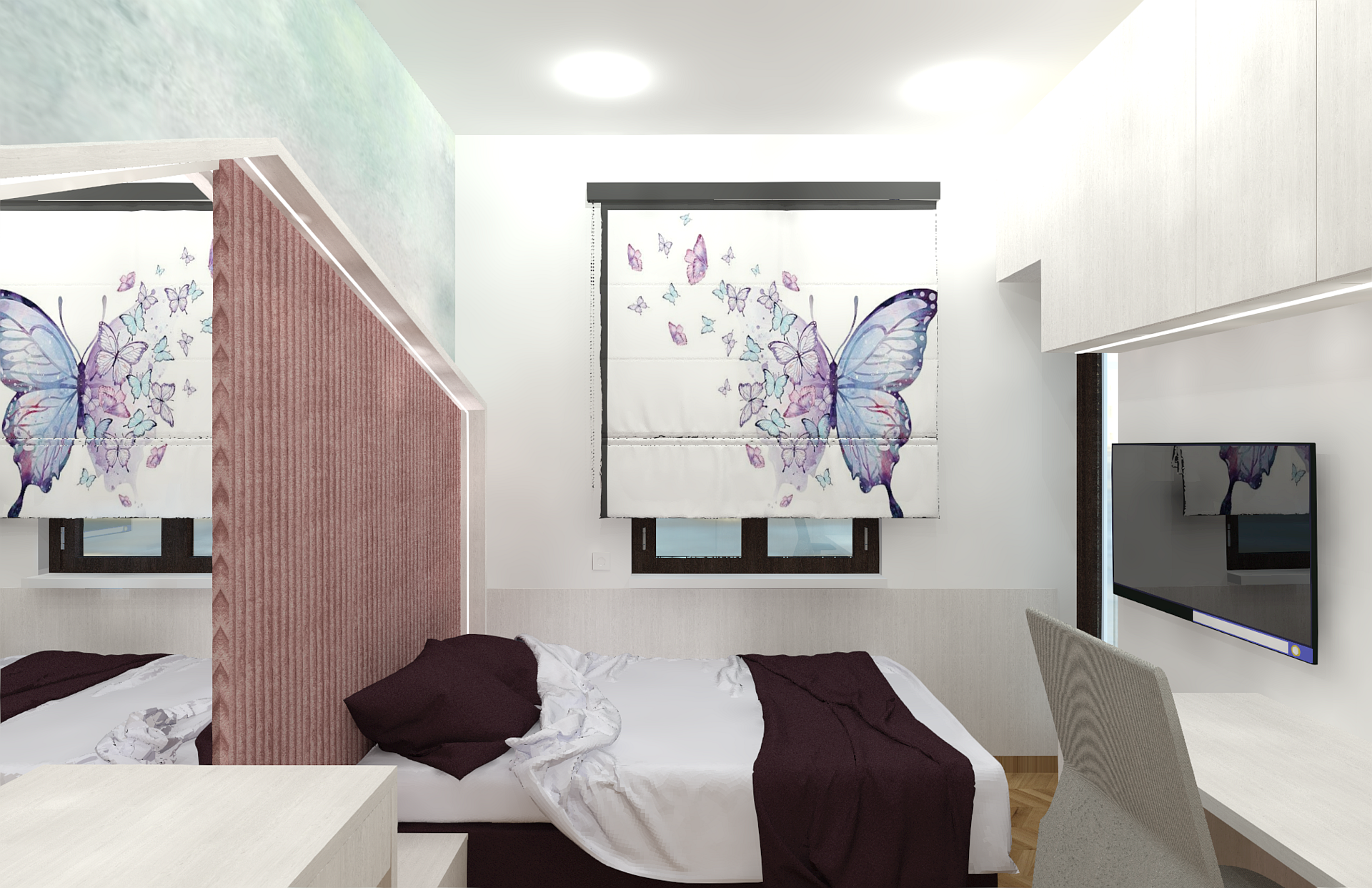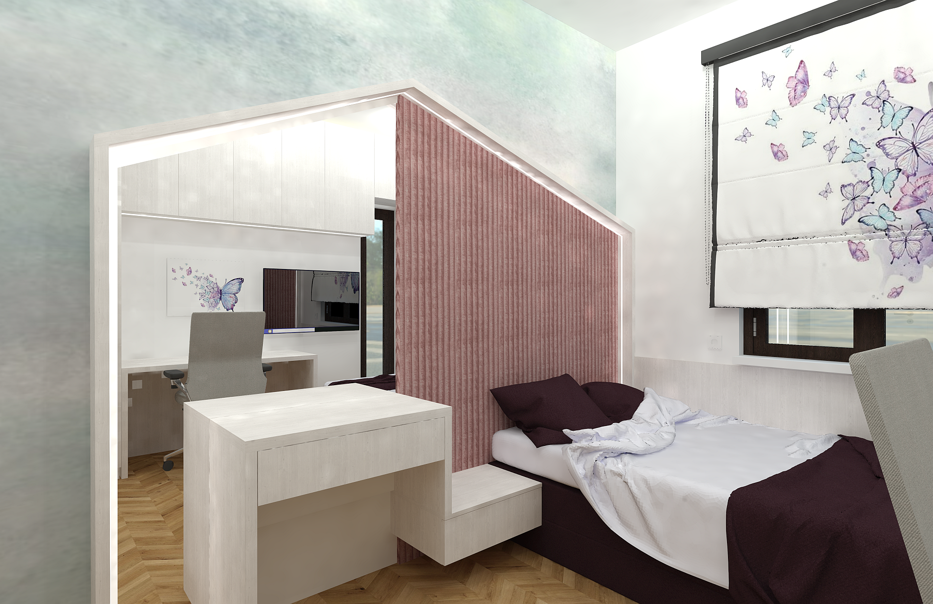 Proiectul prezentat mai jos este un exemplu de amenajare gândită pentru o fetiță care are nevoie de un spațiu organizat, feminin, luminos și cald – un loc unde să se odihnească, să se joace și să-și dezvolte imaginația.