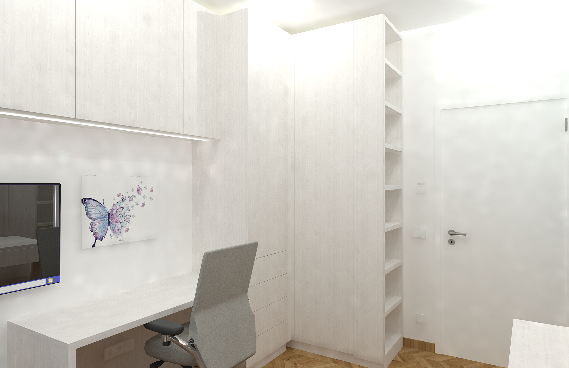 Deasupra patului și în jurul biroului, sunt proiectate dulapuri suspendate în finisaj alb mat, ce oferă spații generoase de depozitare.