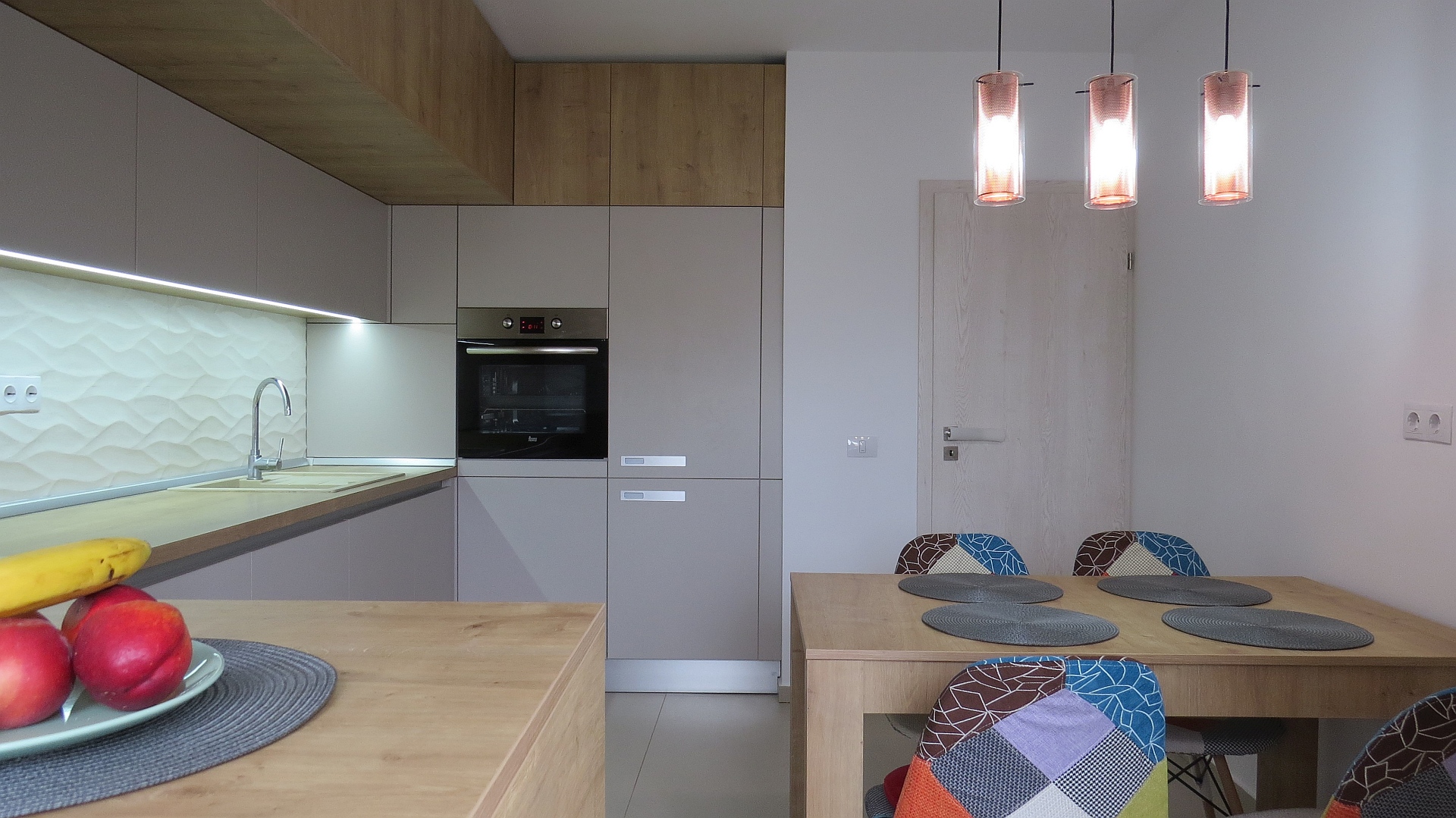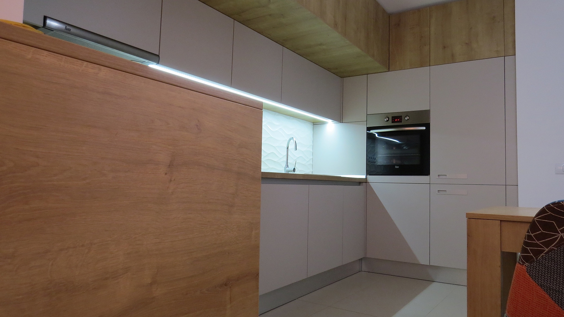 Mobila bucatarie Andrada este despre design . Provocarea maxima a fost sa rezolvam uratenia si lipsa de functionalitate a unei grinzi pozitionate chiar deasupra linie de lucru a bucatariei . Si asta nu era nimic daca nu avea o inaltime de 80cm . si 60 cm latime .