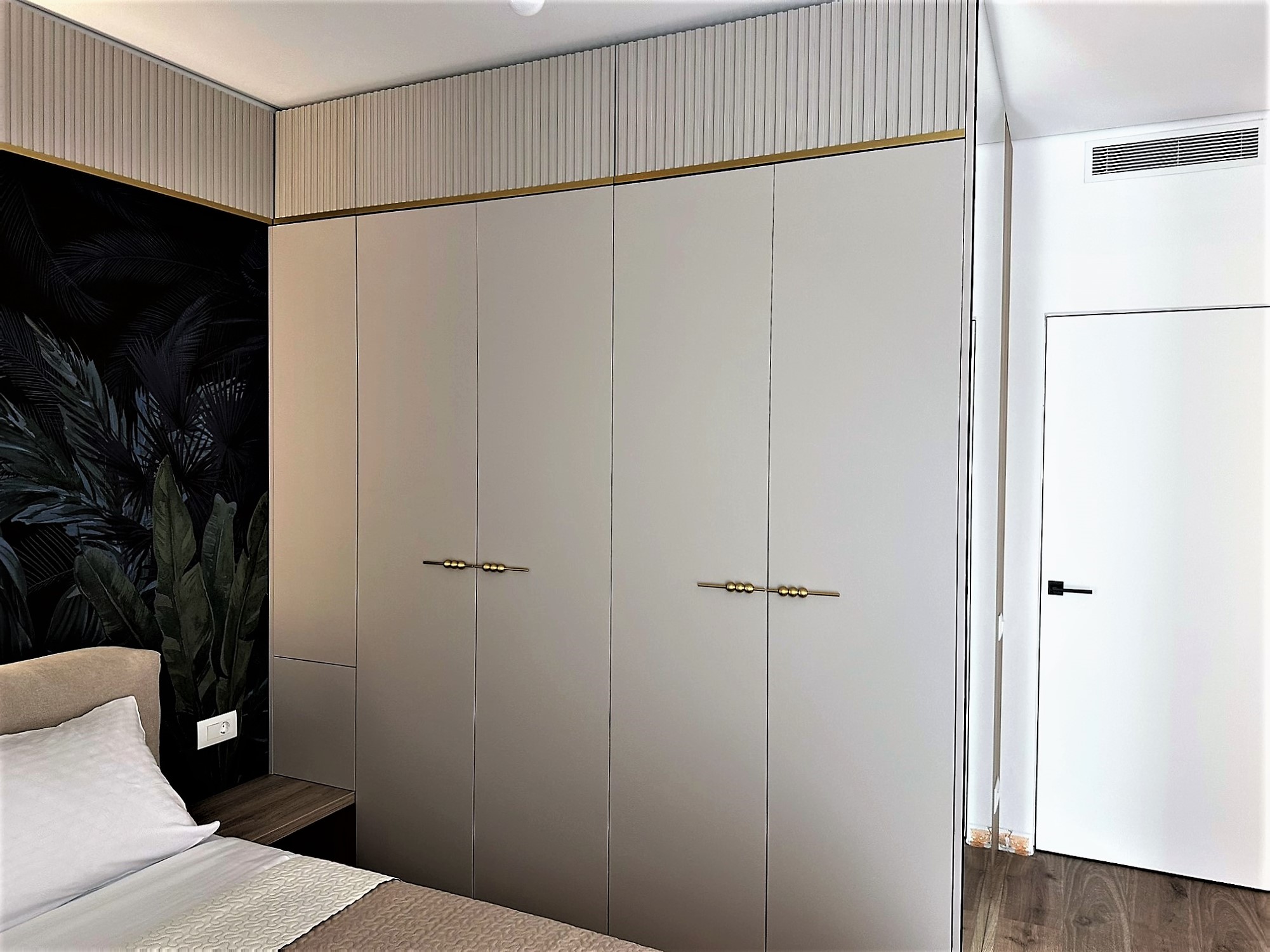 Dulapurile integrate sunt proiectate pentru a maximiza spațiul de depozitare, fără a încărca vizual încăperea. Fronturile netede, mate, și mânerele metalice subtile completează estetica modernă, oferind un aspect unitar și ordonat. Fiecare element al mobilierului este realizat cu precizie, pentru a răspunde nevoilor actuale de funcționalitate și organizare.