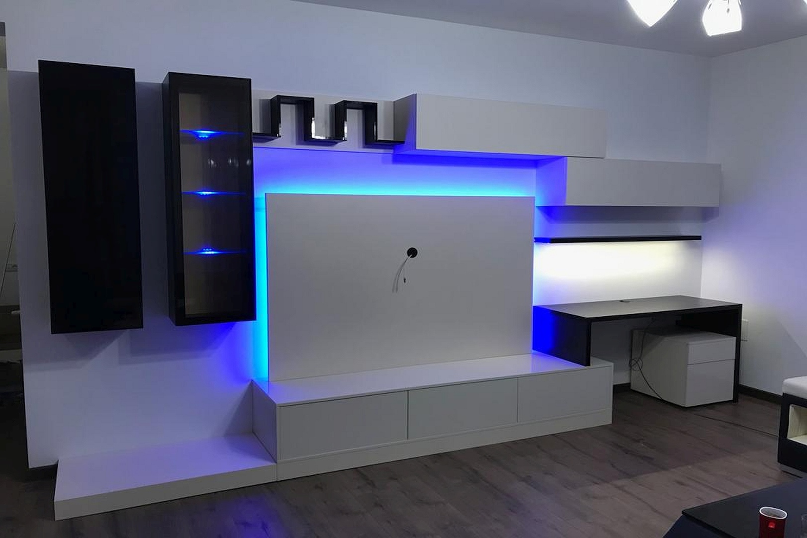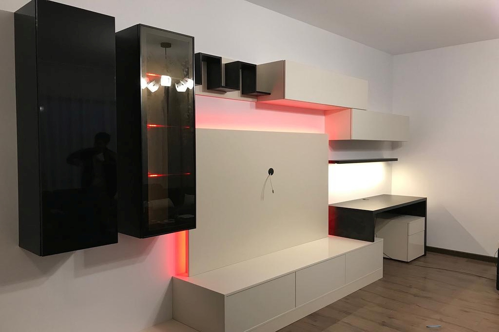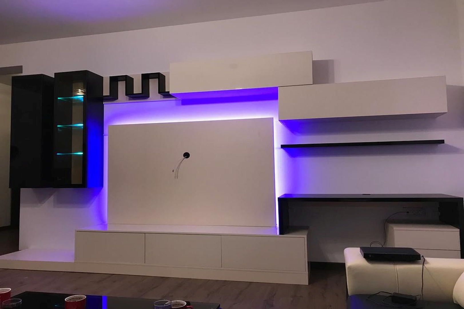 Sistemul de iluminat este facut din 3 sisteme de fapt – zona de birou cu lumina alba , zina de relaxare – partea cu TV are sistem RGB si zona de vitrina sunt sincronizate astfel incat efectul vizual sa fie maxim.