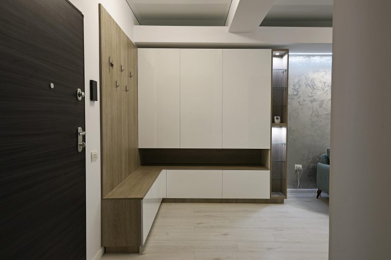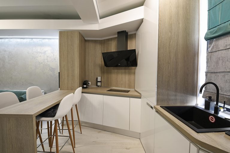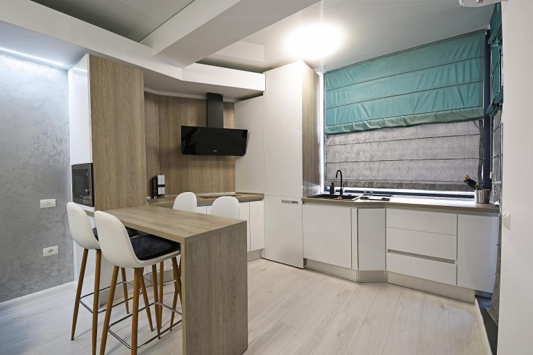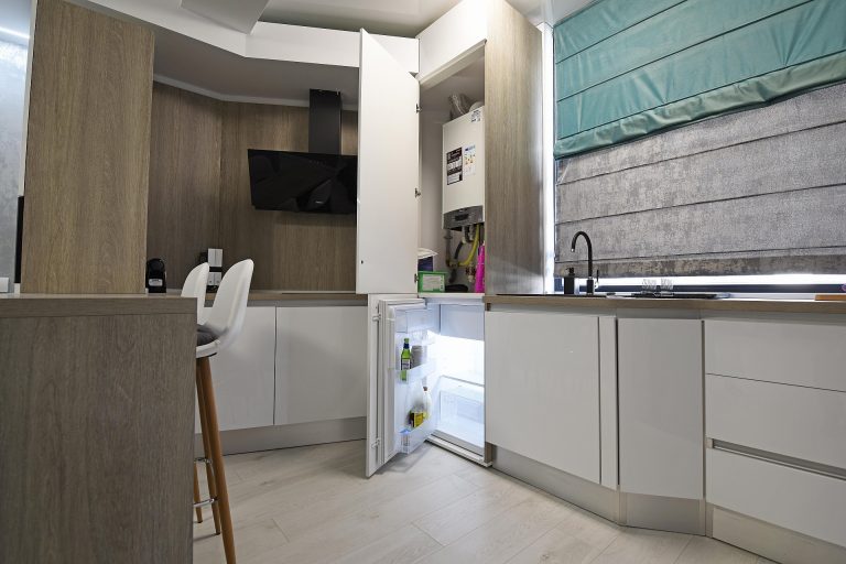 Zona de bucatarie – desi este un spatiu cu probleme datorita unghiurilor dificile a fost exploatat la maxim prin amplasarea chiuvetei sub fereastra si eliberarea zone centrale pentru plita cu inductie si hota . Masca de centrala este si ea folosita la maxim prin instalarea frigiderului in acea zona . Nu lipseste nici masina de spalat rufe cu uscator incoporabila in drapta plitei – prin folosirea acesteia se evita uscarea rufelor pe balcon , acesta ramanand doar pentru relaxare.